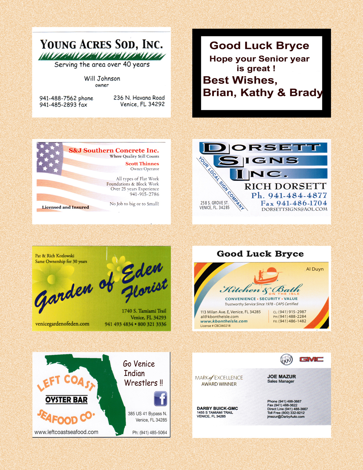 On this page you will find examples (click on thumbnail for a larger image) of various types of sponsorship recognition that appear in our annual printed wrestling program. Recognition can be either family oriented in support of a specific wrestler(s), as well as business related advertisements. Our organization gladly accepts donations anytime, and are particularly needed during our primary fund-raising season (November – March). The Venice Takedown Club, a Florida non-profit, is also a registered 501(c)(3) public charity. All funds benefit the Venice High School Wrestling Team and Venice Warriors Youth Wrestling Program by paying for expenses such as hotel and travel costs, uniforms, equipment, instructional camps, awards and more. (Click here to pay or donate via Paypal / credit card) Required Statement: A copy of the official Venice Takedown Club, Inc. registration and financial information may be obtained from the Division of Consumer Services by calling toll free within Florida (800-435-7352), or visiting their website (FDACS.gov). Registration does not imply endorsement, approval, or recommendation by the state.